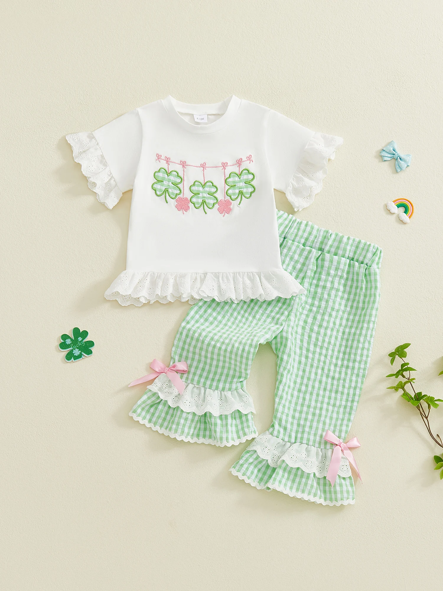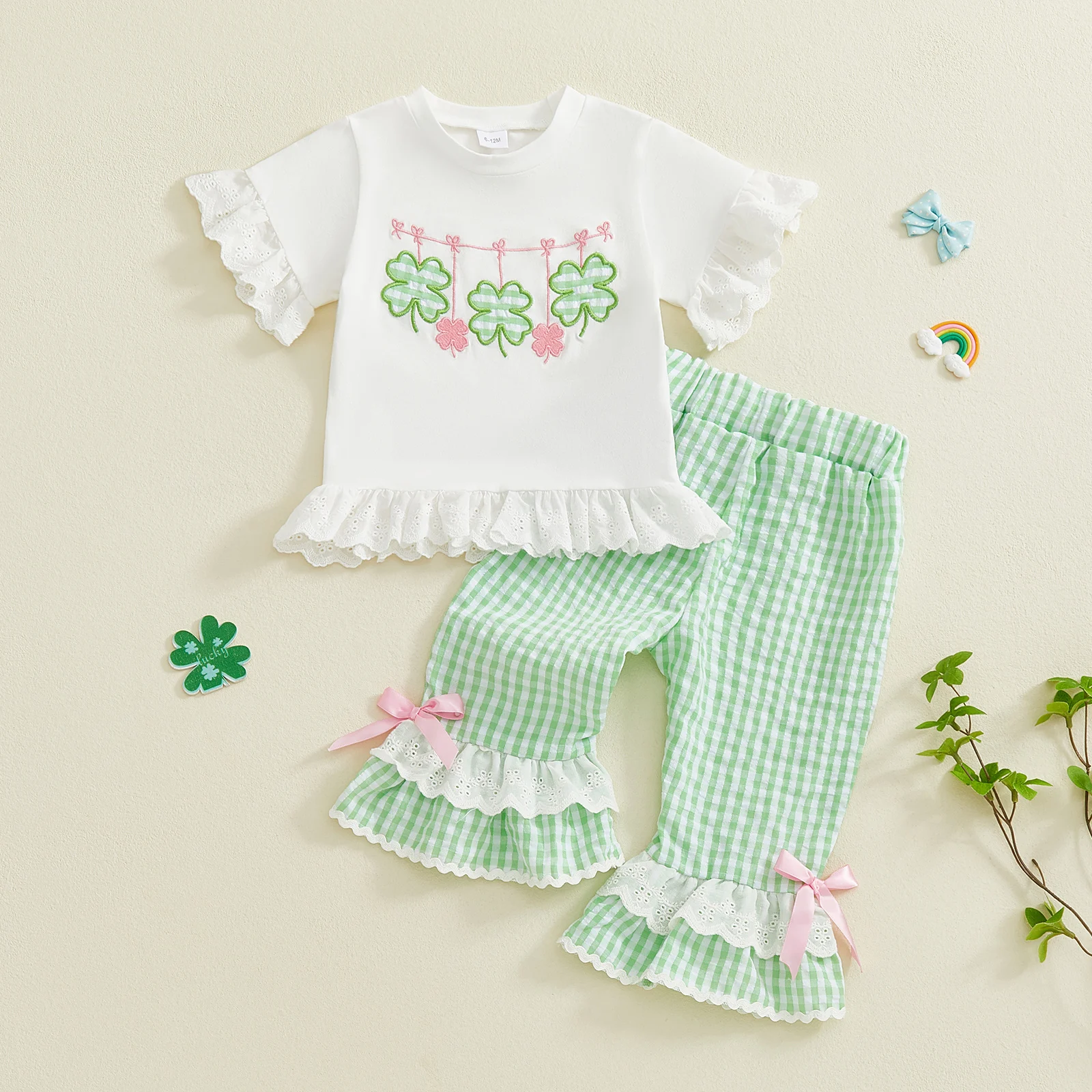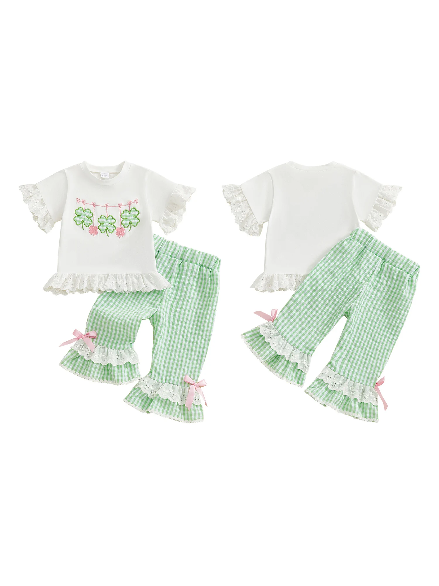 Celebrate in lucky style with this adorable St. Patrick’s Day 2-piece outfit for toddler girls! This festive set features a short sleeve top with charming clover embroidery paired with trendy elastic waist flared pants for a fun, comfortable fit.