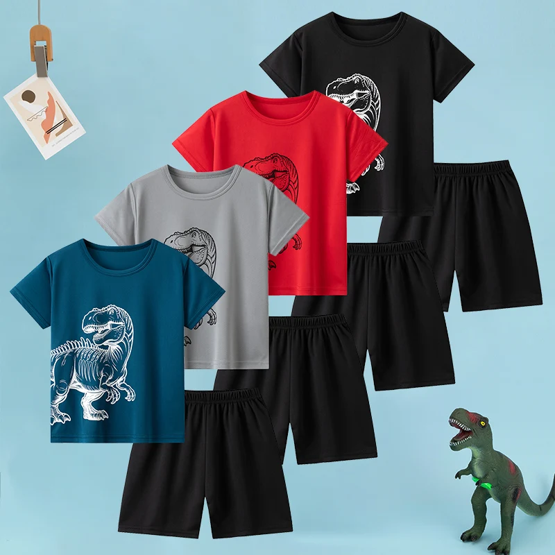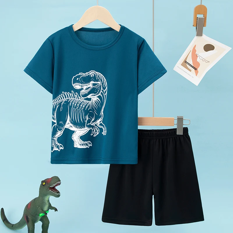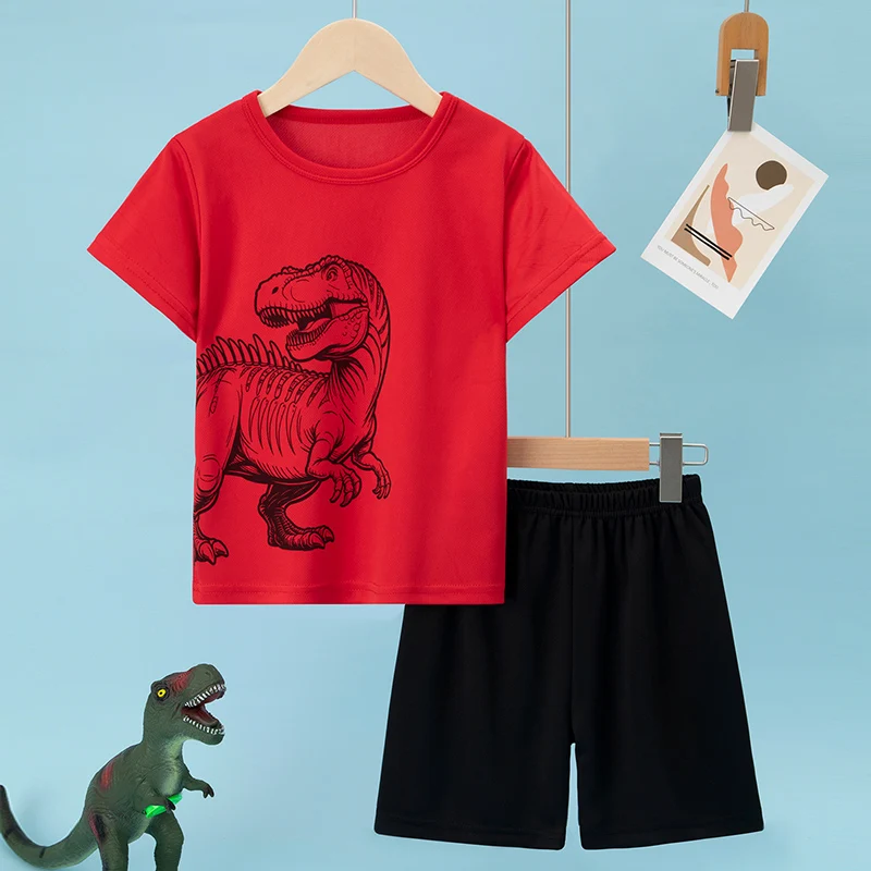 Get your little one ready for active summer fun with this quick-drying 2-piece sports set! Featuring a cool dinosaur print short-sleeve top and matching black shorts, this outfit is perfect for energetic kids. Made from lightweight, breathable fabric, it keeps children comfortable and dry during playtime, sports, or outdoor adventures. Stylish and practical for both boys and girls, it’s a must-have for summer activities.