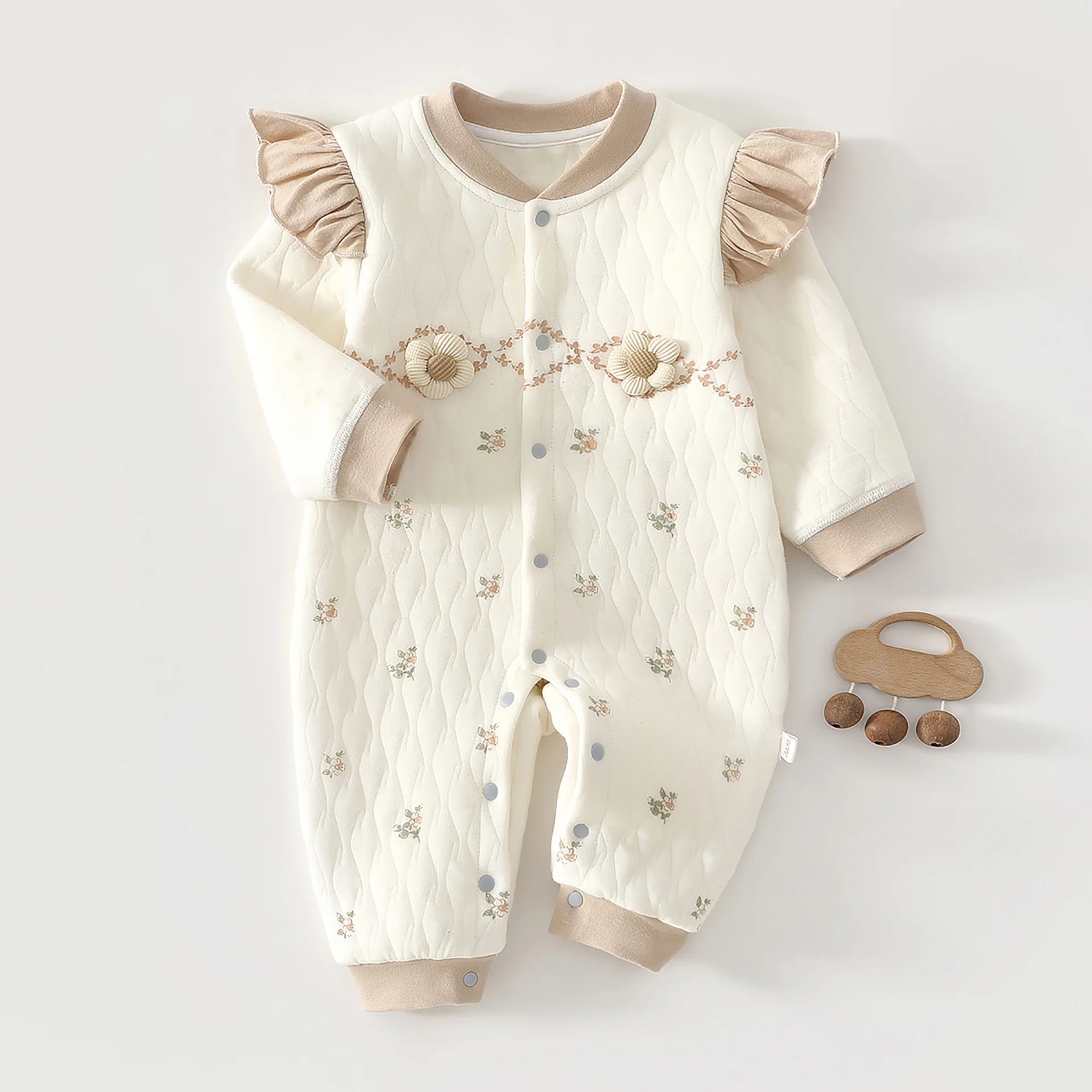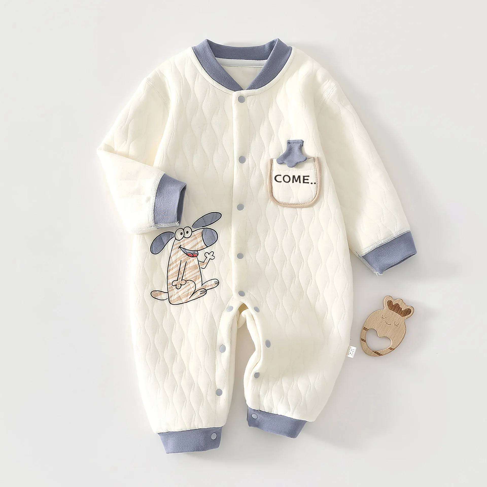 This baby jumpsuit is designed to keep newborns warm and comfortable during cooler seasons. Made with thick, three-layer cotton, it provides excellent insulation without feeling heavy. The soft fabric is gentle on delicate infant skin. Its one-piece design allows easy movement for crawling and play. Long sleeves help protect babies from chilly air. The jumpsuit is easy to put on and take off for quick changes. It offers a cozy fit suitable for everyday wear. Designed for babies from 0 to 18 months, it grows with your child. Durable stitching ensures long-lasting use. This warm outfit is perfect for autumn outings and indoor comfort.